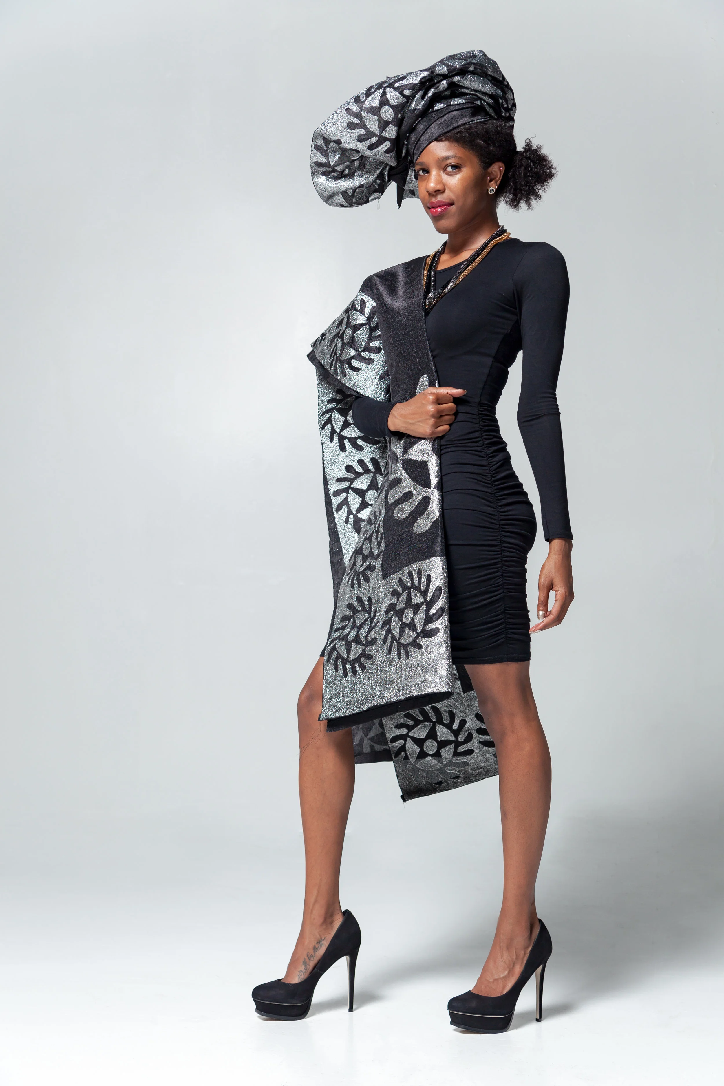A person modeling a black dress with a silver and black patterned scarf and head wrap, wearing black high heels.