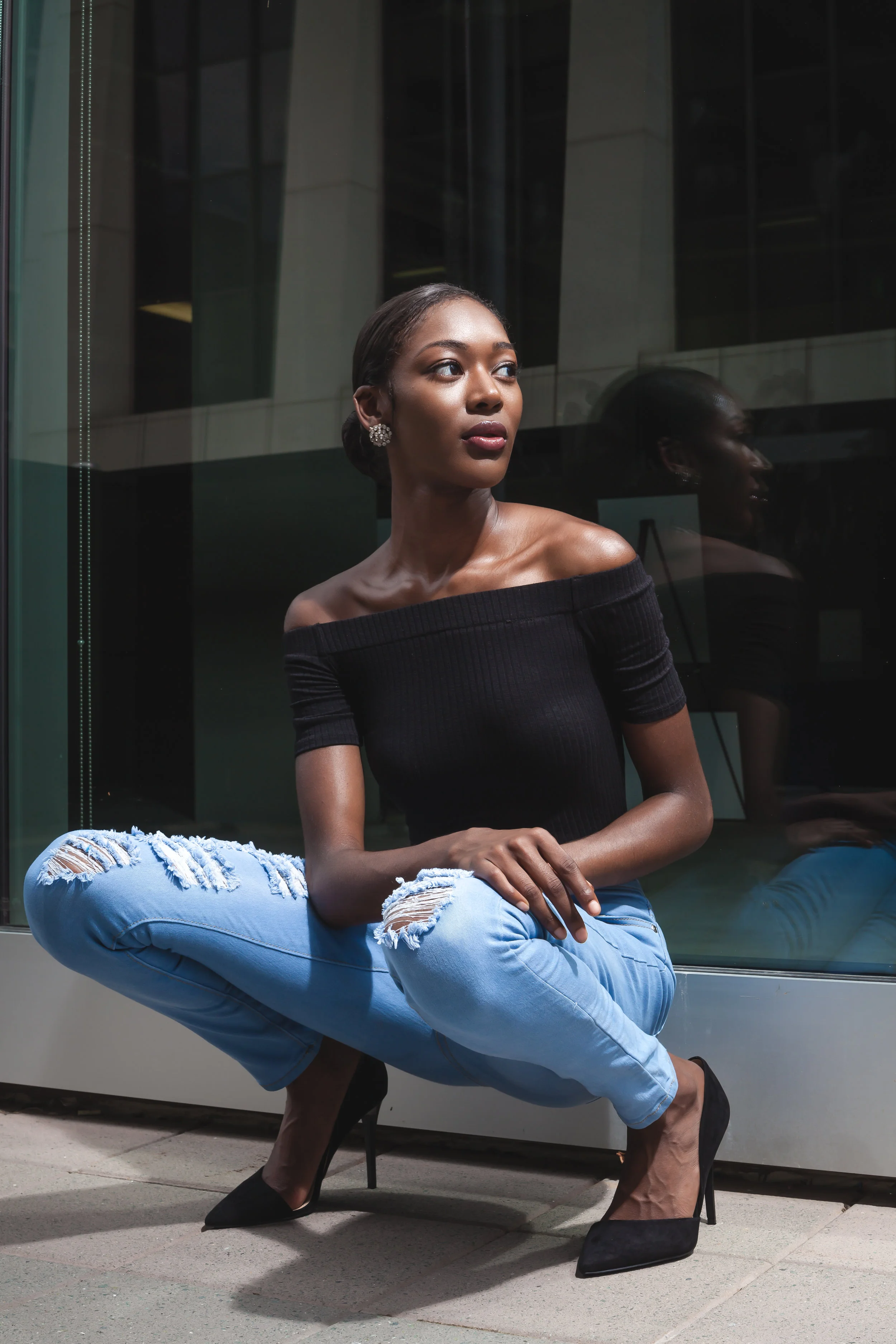 Woman squatting in a black off-shoulder top and ripped jeans, leaning against a glass window.