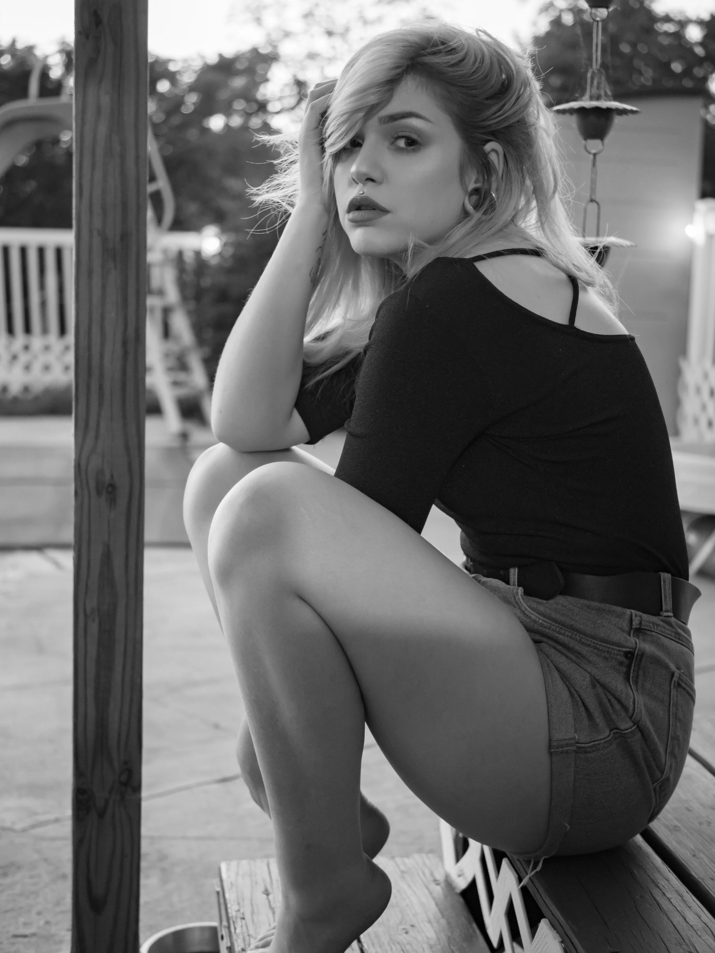 Black and white photo of a woman with long hair sitting outdoors, wearing a black top and denim shorts. View fullsize