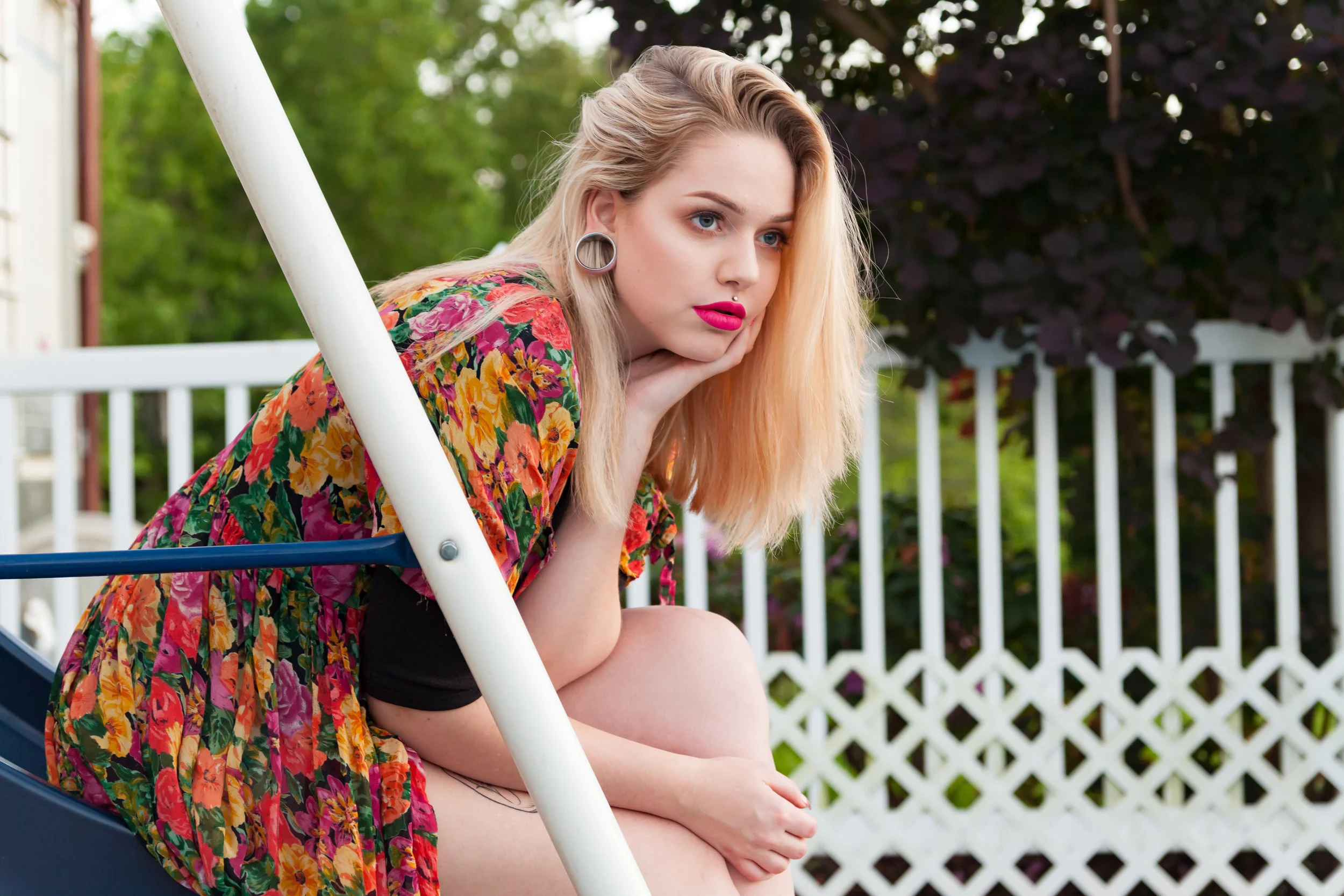 Woman with blonde hair and floral dress sitting outdoors, leaning on a playground slide. View fullsize