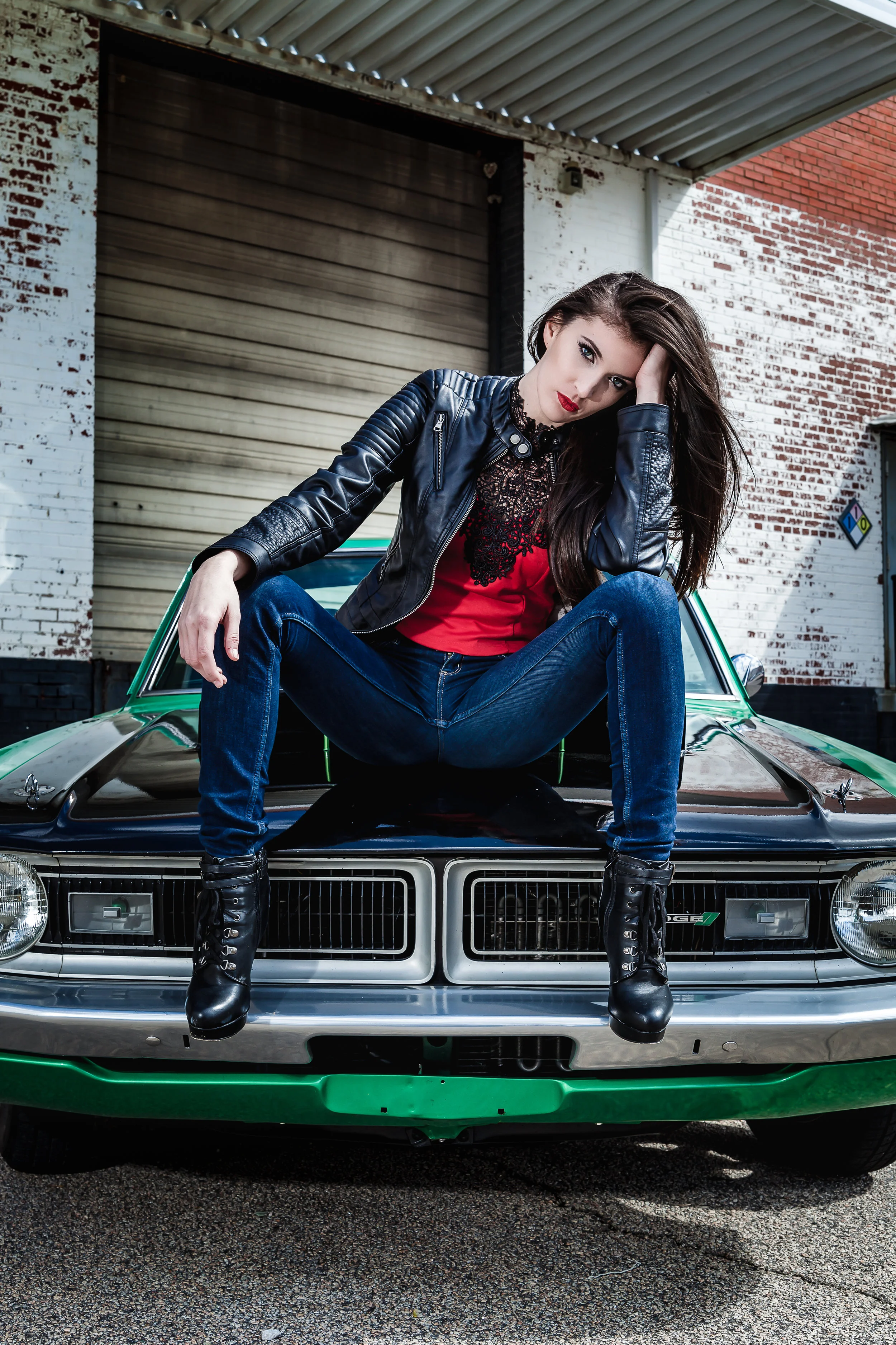 Woman sitting on vintage car hood wearing a black leather jacket and jeans.