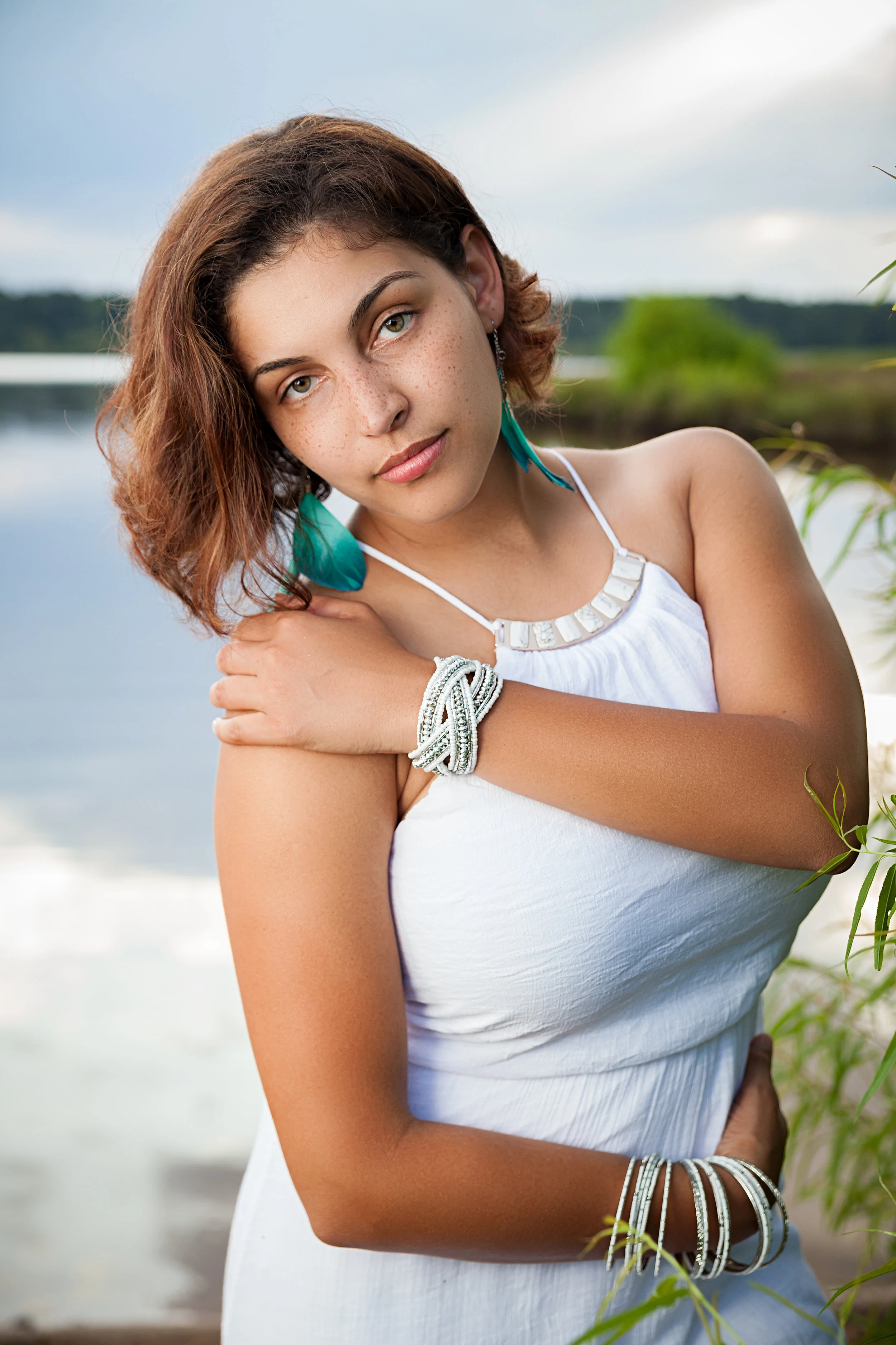 Woman in white dress with blue feather earrings near a lake View fullsize